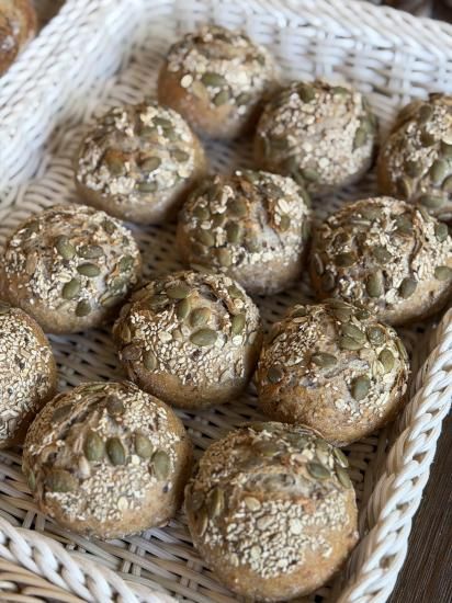 北海道ライ麦全粒粉40%配合。ふやかしたオーガニックライフレーク、オーツ麦、ひまわりの種、ごま、亜麻仁を加えたドイツパン。パン表面にも種をまぶし、香ばしく焼き込みました。焼成前100gほどの小型ドイツパンです。気軽にドイツパンを試してみたい方に。