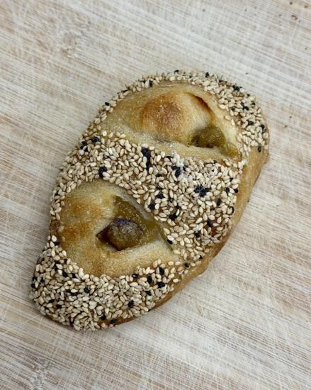 店主手作りの千葉県産シルクスイートの甘露煮を低温長時間熟成自家製酵母バゲットの生地で包み、胡麻をまとわせて香ばしく焼きあげました。